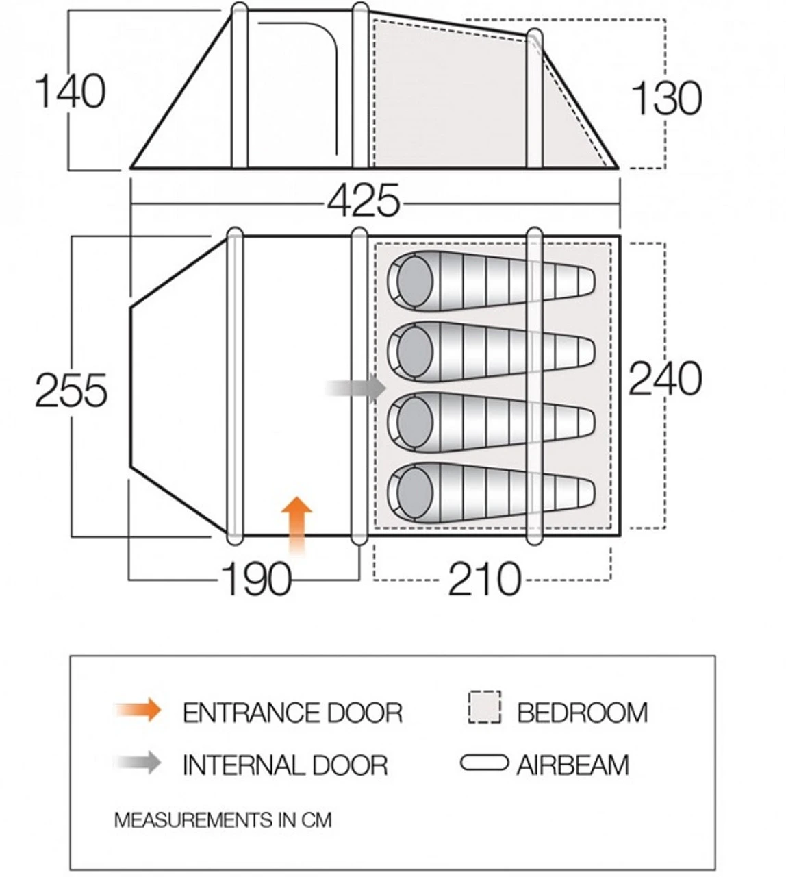 The Vango Skye II Air 400 tent is an easy to pitch, compact, four person tunnel tent. It is the smallest inflatable tent in the AirBeam range and well priced when compared to other family tents. The Vango Skye tent features a side entry door and a spacious porch area perfect for storing muddy boots and camping kit. This four man tent features Vango’s Nightfall bedrooms which block out early morning light giving you a great nights sleep on your camping trip. The Skye II is perfect for families looking for a compact four berth tent or couples looking for a bit more space.